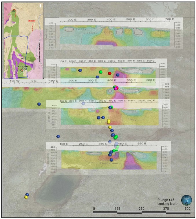 A '3D' IP survey was recently completed over the Nutaaq trend. Processing of the field data and evaluation of the IP results will be used to refine the drill targets north and south of the Gnu Zone.