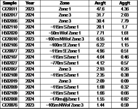 Table 1: Blue Star's 2023-24 samples grading over 1 g/t Au.
