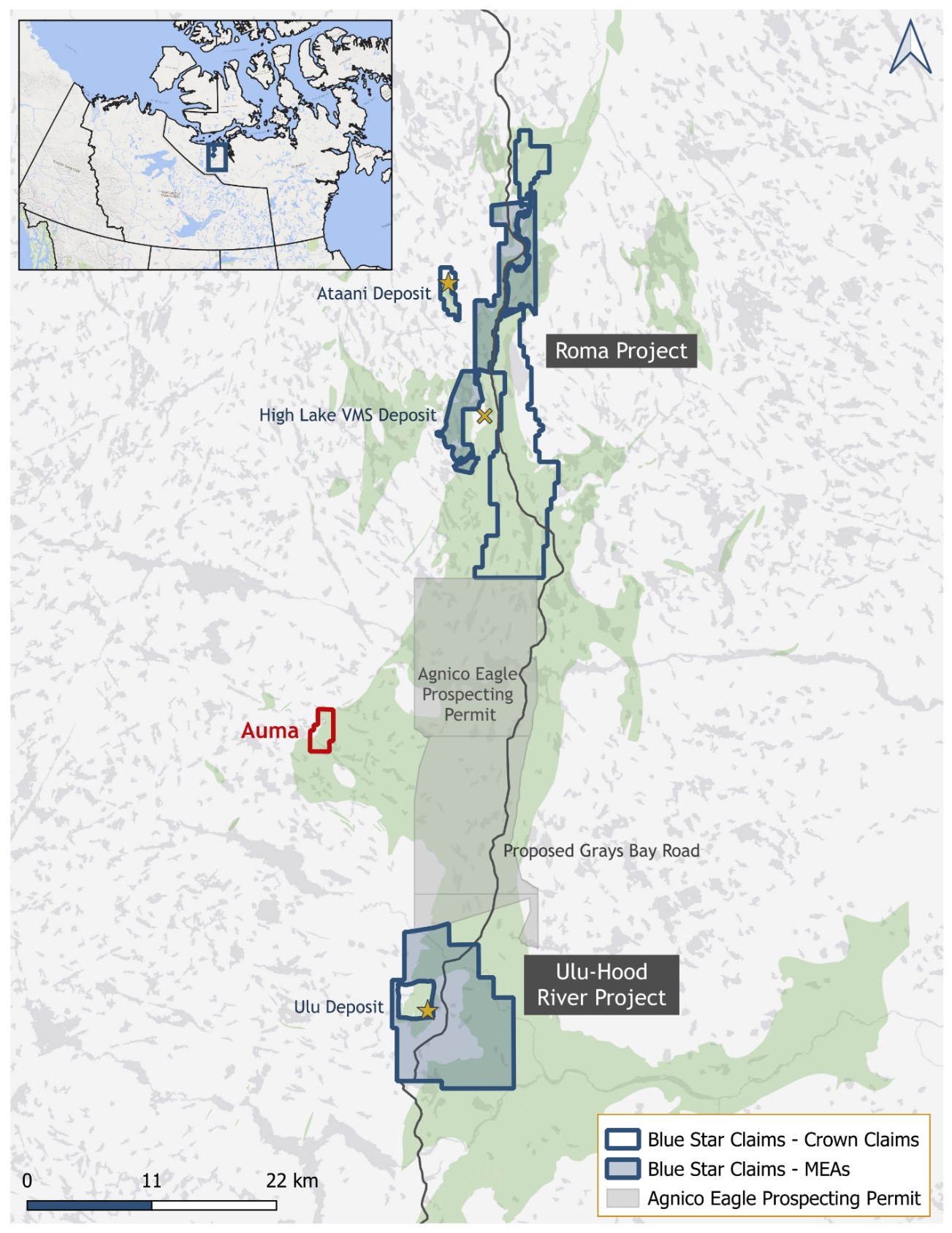 Blue Star is a mineral exploration and development company focused in Nunavut, Canada. Blue Star's landholdings total 290 square kilometres of highly prospective and underexplored mineral properties in the High Lake Greenstone Belt. The Company owns the Ulu Gold Project, comprised of the Ulu Mining Lease and Hood River Property, and the Roma Project. A significant high-grade gold resource exists at the Flood Zone deposit (Ulu Mining Lease), and numerous high-potential exploration targets (gold and critical minerals) occur throughout the Company's extensive landholdings, providing Blue Star with excellent resource growth potential. The site of the future deep-water port at Grays Bay is 40 - 100 km to the north of the properties, and the proposed route corridor for the all-weather Grays Bay Road passes close by the Roma and Ulu Gold Projects.