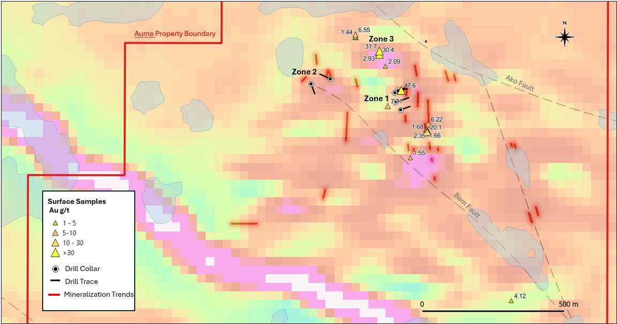 Figure 2: Auma Target Area Showing Gold Zones, Surface Grabs, Mineralisation Trends and Historical Drilling. Background Image is a 2004 DIGHEM Total Magnetics Survey.