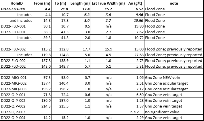 DD22-FLO-001 returned 6.52 grams/tonne (“g/t”) gold over 17.4 m, including 9.96 g/t gold over 6.3 m starting at 4.40 m downhole, and 7.62 g/t over 3.0 m and 19.80 g/t over 0.50 m.