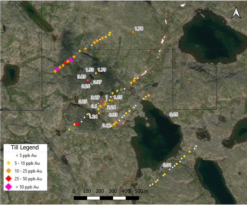 A second pass sampling effort was made to better define a New Showing highlighted by the 2022 till sampling program. The known arsenopyrite veining occurs over a 320-metre x 170-metre area proximal to a granitoid-metasediment contact with select samples returning assay values in the range of 1.00 to 3.89 g/t Au. Sampling this season indicates that the gold mineralisation is associated with arsenic ("As"), Pb, and copper ("Cu") (Figure 2). Additional till sampling lines followed by detailed prospecting and mapping are required to advance the target.