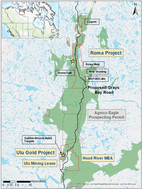 Blue Star is a mineral exploration and development company focused in Nunavut, Canada. Blue Star's landholdings total 270 square kilometres of highly prospective and underexplored mineral properties in the High Lake Greenstone Belt. The Company owns the Ulu Gold Project, comprised of the Ulu Mining Lease and Hood River Property, and the Roma Project. A significant high-grade gold resource exists at the Flood Zone deposit (Ulu Mining Lease), and numerous high-potential exploration targets (gold and critical minerals) occur throughout the Company's extensive landholdings, providing Blue Star with excellent resource growth potential. The site of the future deep-water port at Grays Bay is 40 - 100 km to the north of the properties, and the proposed route corridor for the all-weather Grays Bay Road passes close by the Roma and Ulu Gold Projects.