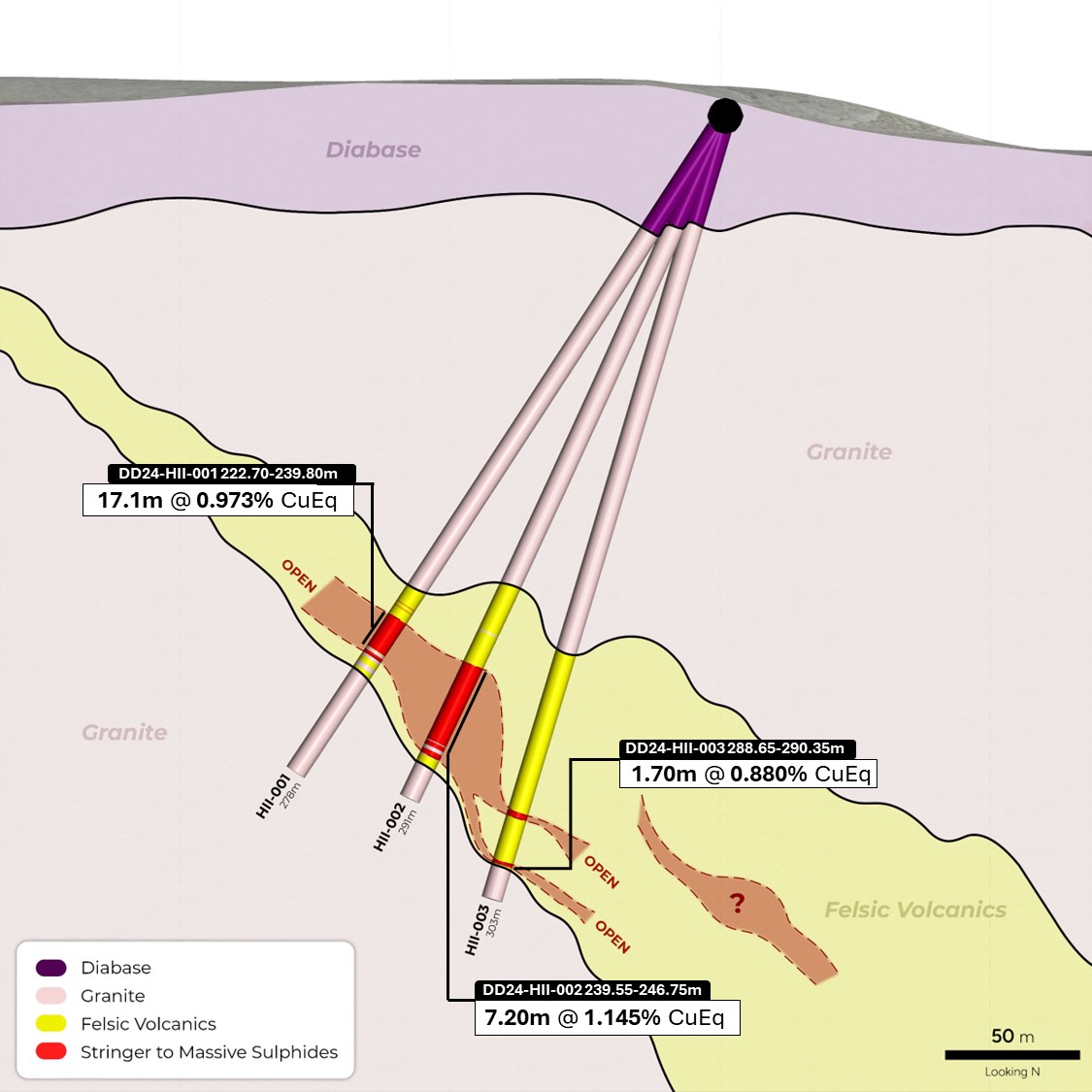 DD24-HII-002 targeted ~45 metres below the 17.1 metre sulphide intercept in the first hole. This drillhole completed to a depth of 279 metres encountered the overlaying Proterozoic diabase sill, a late Archean granitoid unit, and a package of sericite-altered felsic tuffs hosting a thirty-seven (37.25) metre zone of stringer to massive sulphide mineralisation. A 26.9 metre stringer to massive sulphide section returned 0.576% CuEq or 0.413% Cu, 0.035% Zn, 0.104 g/t Au and 10.929 g/t Ag. Sulphides encountered were predominantly pyrite and pyrrhotite, with a 7.2 metre zone grading 1.145% CuEq, or 0.906% Cu, 0.027% Zn, 0.25 g/t Au and 20.066 g/t Ag which includes 4.45 metres of 1.028% Cu, 0.033% Zn, 0.149 g/t Au and 22.240 g/t Ag.