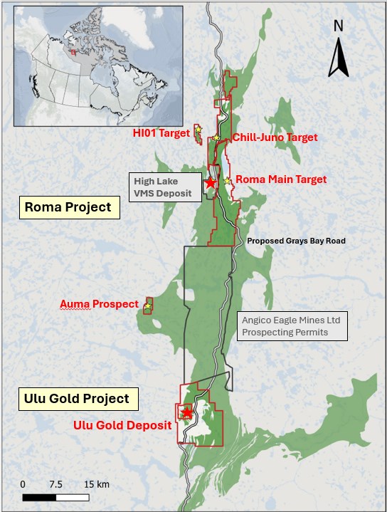 Blue Star is a mineral exploration and development company focused in Nunavut, Canada. Blue Star's landholdings total 270 square kilometres of highly prospective and underexplored mineral properties in the High Lake Greenstone Belt. The Company owns the Ulu Gold Project, comprised of the Ulu Mining Lease and Hood River Property, and the Roma Project. A significant high-grade gold resource exists at the Flood Zone deposit (Ulu Mining Lease), and numerous high-potential exploration targets (gold and critical minerals) occur throughout the Company's extensive landholdings, providing Blue Star with excellent resource growth potential. The site of the future deep-water port at Grays Bay is 40 - 100 kilometres to the north of the properties, and the proposed route corridor for the all-weather Grays Bay Road passes close by the Roma and Ulu Gold Projects.