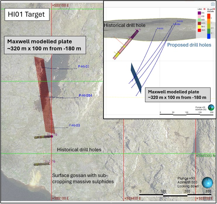 - At HI01 a near surface conductor over the known massive sulphide exposure and a sub-vertical north plunging strong conductor were identified by a fixed loop electromagnetic survey ("EM"). The target conductor measures ~320-metres x 100-metres. Depth to the top of the modeled plate is 180 metres. This modelled conductor is located down dip and down plunge of historical drilling and known massive sulphide intersections (Figure 2)