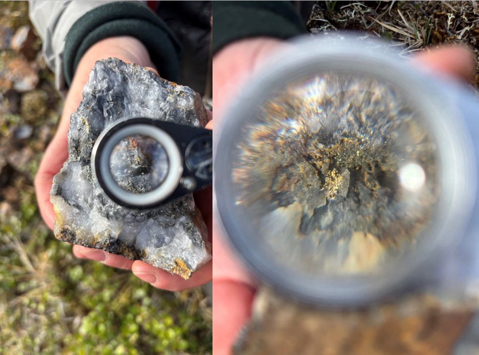 Initial field orientation traverses by the exploration team identified Nutaaq vein material in felsenmeer east of any veins previously tested in the Nutaaq target. Very fine visible gold was observed in a 10-metre section of 30-50 metres of frost-heaved vein material and host rock. A grab sample from the area in 2024 described as frothy white quartz returned 23 g/t gold (Blue Star News Release dated October 16, 2024). Historical samples (1992) in the area returned 29, 35 and 78 g/t gold (Ulu South Map 15, sample location and geochemistry, BHP 1992).