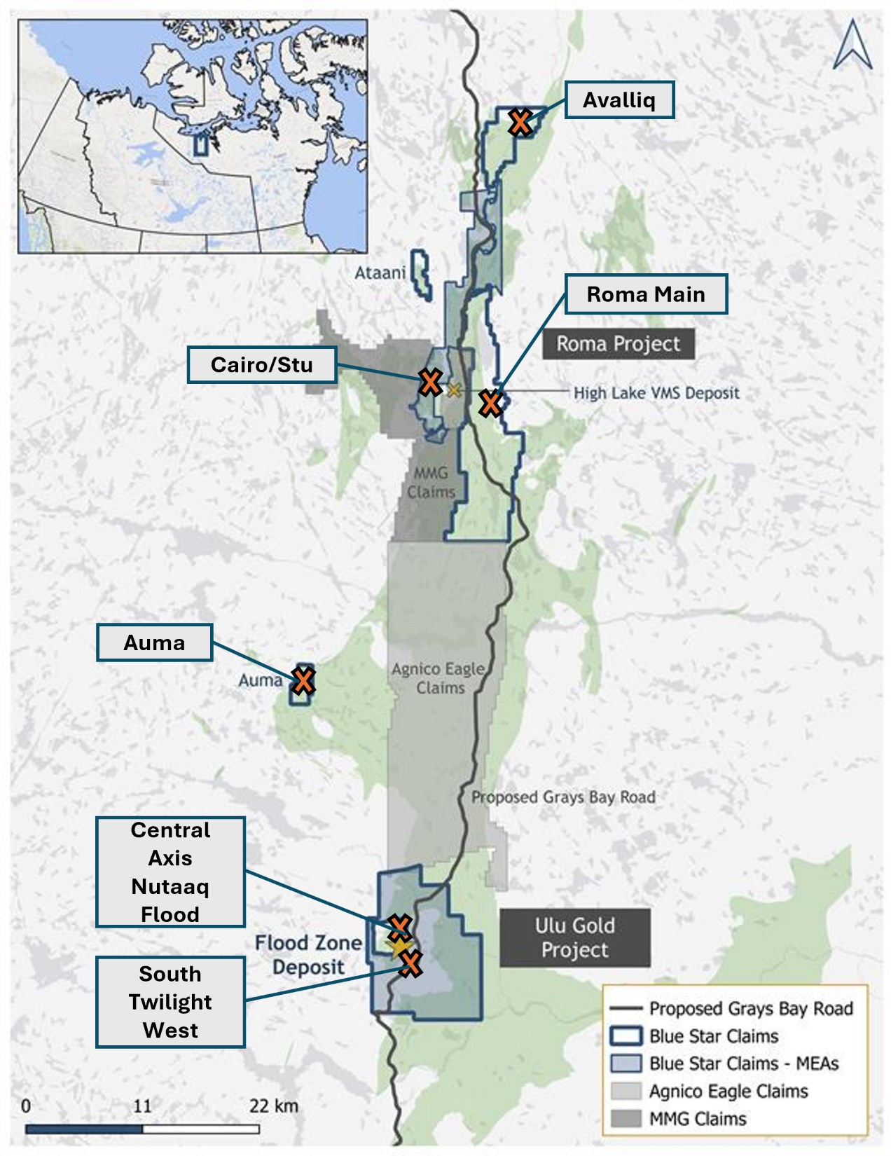 Blue Star is a mineral exploration and development company focused in Nunavut, Canada. Blue Star's landholdings total 300 square kilometres of highly prospective and underexplored mineral properties in the High Lake Greenstone Belt. The Company owns the Ulu Gold Project, comprised of the Ulu Mining Lease and Hood River Property, and the Roma Project. A significant high-grade gold resource exists at the Flood Zone deposit (Ulu Mining Lease), and numerous high-potential exploration targets (gold and critical minerals) occur throughout the Company's extensive landholdings, providing Blue Star with excellent resource growth potential. The site of the future deep-water port at Grays Bay is 40 - 100 km to the north of the properties, and the proposed route corridor for the all-weather Grays Bay Road passes close by the Roma and Ulu Gold Projects.