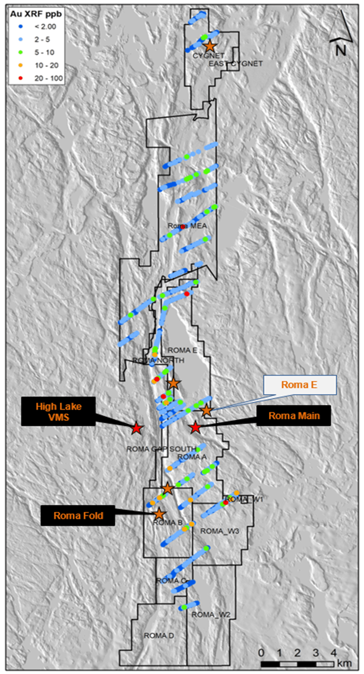 The Roma Project encompasses ~18,900 hectares of the northern High Lake Belt, covering several high grade gold and critical mineral showings.